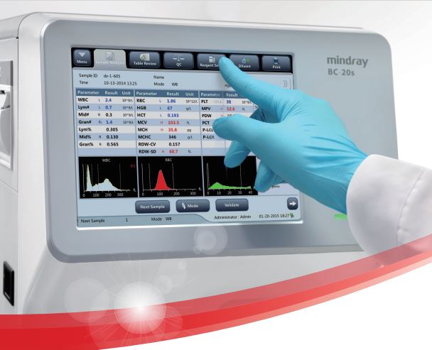 - Определяемые параметры: 19 параметров - WBC, Lymph#, Mid#, Gran#, Lymph%, Mid%, Gran%, RBC, HGB, HCT, MCV, MCH, MCHC, RDW-CV, RDW-SD, PLT, MPV, PDW, PCT; 3 гистограммы для подсчета WBC, RBC и PLT